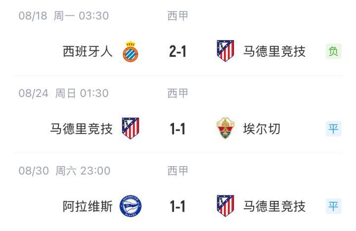 马竞首轮1-2遭西班牙人逆转,第二场1-1战平埃尔切。值得一提的是,马竞三场都是先进球。